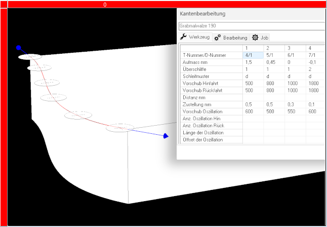 - Variable Größen wie Aufmaß, Überlauf, Versatz, Anzahl der Überschliffe für verschiedene Körnungen